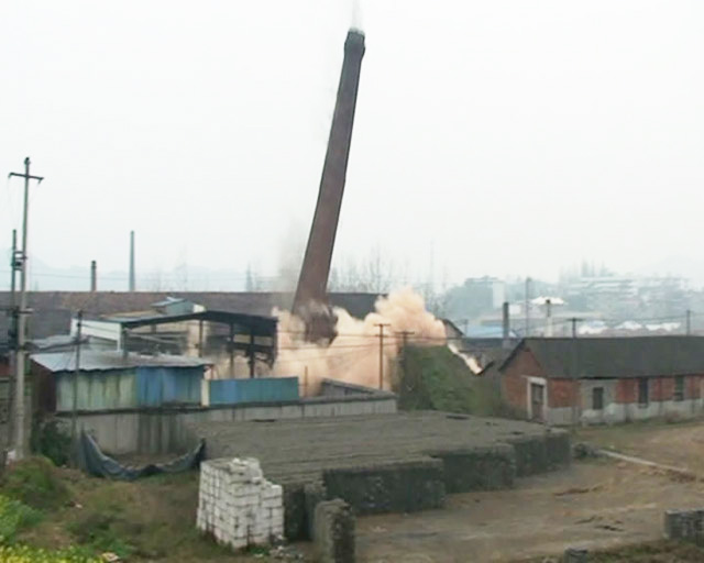受富阳市新登镇人民政府委托,我公司承接了该抢险工程项目。在当地各级政府、杭州市公安局、富阳市公安局及企业的大力支持下,我公司组织了精兵强将,精心设计,严格施工,对施工作业人员、周边厂房、设施(设备)采取了周密的防护措施,仅使用了12Kg炸药就成功将该烟囱按预定方向实施爆破,爆破振动、飞石、冲击波等多项指标均控制在最小范围内,爆点周围建筑物、设施毫发无损,项目取得了圆满成功。